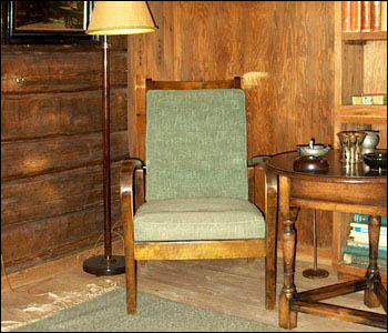 Rechts steht der Sessel von Sibelius, der in den 1940er Jahren von Kammionkatu gebracht wurde. Der daneben stehende Schrank mit Plattenspieler ist ein Geschenk von Pohjoismaiden Sähkö Oy und das Radio samt dem Plattenspieler bekam der Komponist Anfang der 1950er Jahre von der Firma Philips.