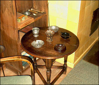 Weiter hinten im Zimmer steht der Rauchtisch mit einer Kristallglasplatte und die von Boman Oy angefertigten Sessel. Die restlichen Sessel sowie die kleinen Tische sind aus der Wohnung in Kammionkatu.