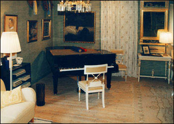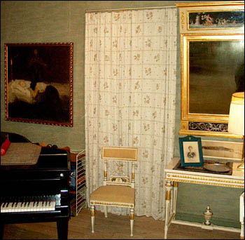 An der Wand hinter dem Flügel hängt ein großformatiges und düsteres Ölgemälde Bönen till Gud (Gebete an Gott) von Oscar Parviainen (1880–1938). Das Regal unterhalb des Gemäldes von Parviainen beinhaltet Glückwunschadressen, wie auch Notengrüße von Schostakowitsch und Prokofjew. Kondolenzschreiben gibt es auch in den Schachteln auf dem Flügel. Die Gardinen rechts verdecken die Tür, die nach unten in das auf den Balkon führende Außentreppenhaus führt.