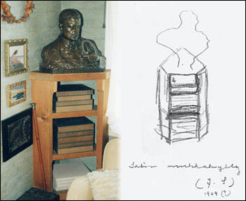 Links davon steht das von Sibelius 1909 entworfene massive Regal, das mit Noten von Aino Sibelius gefüllt ist.