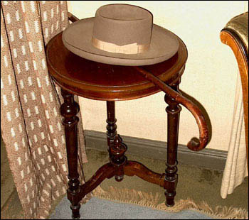 in der immer noch die Rasierapparate, Rasierseifen und Zahnpasten von Sibelius zu sehen sind. Auf dem Tisch rechts der Waschecke liegen die Sibelius-Symbole: ein Spazierstock und ein breitkrempiger Hut in italienischem Stil.