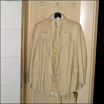 Der weiße Anzug hängt auf dem Kleiderbügel neben der Tür des kombinierten Arbeits- und Schlafzimmers von Sibelius.