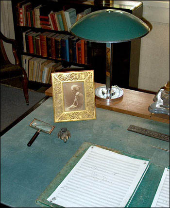 Der antike Sessel vor dem Tisch stammt aus dem Nachlass Alexander Järnefelts. Im Regal rechts vom Fenster steht u. a. das Metronom, das der Komponist in seinen alten Tagen benutzt haben mag, als er den Dirigenten seiner Werke normative Metronomwerte aufschrieb, „um die schlimmsten Fehler zu vermeiden“.