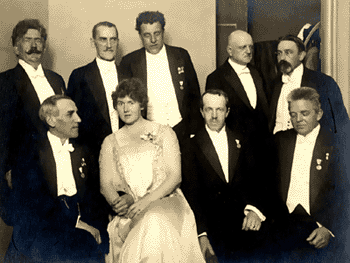Die Nordischen Musiktage in Kopenhagen 1919. In der hinteren Reihe: Johan Halvorsen, Robert Kajanus, Georg Høeberg, Jean Sibelius und Frederik Schnedler-Petersen. In der vorderen Reihe: Wilhelm Stenhammar, Karin Bronzell, Erkki Melartin und Carl Nielsen.