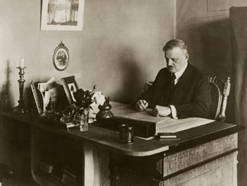 Sibelius in seinem Arbeitszimmer bei Kompositionsarbeiten an seiner Symphonie