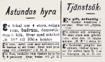 att söka bostad och satte in en sökannons i Hufvudstadsbladet